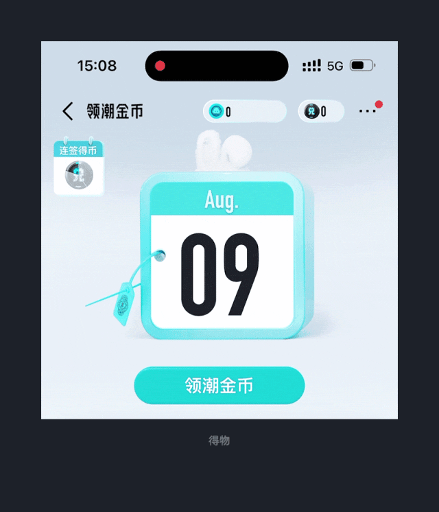 在得物 App 签到设计中,以动态演变来体现签到前后的变化,让用户直观地看到签到天数和奖励机制等。以动效的形式将签到前的日历盒子进行演变,提高了用户对签到过程的关注度。动效表达流畅自然,视觉感知清晰明了,提升了用户的签到体验。