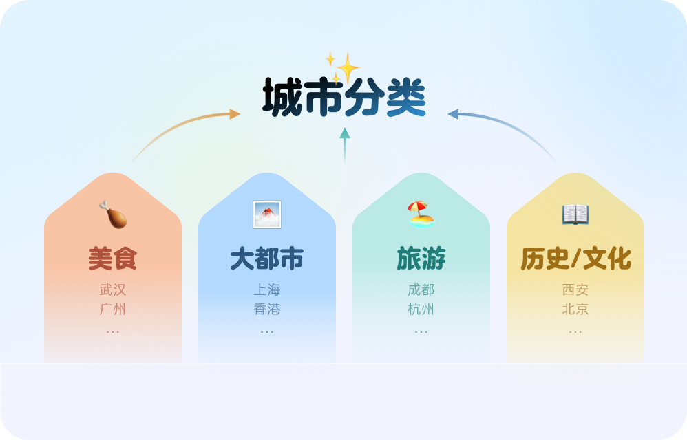 城市特色 地标美食我们的目标是让用户对旅行目的地留下深刻而美好的印象,因此我们对每个城市进行了详细的分类,以突出它们的主要特征。我们将城市分为历史/文化、大都市、旅游和美食四个方面,涵盖了旅行中最受欢迎的元素。